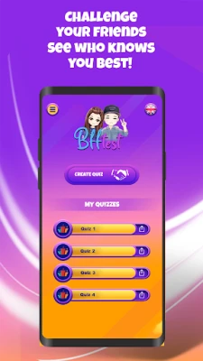 The question is - how well do you know me? Create a best friend test with 10, or 20 questions for a BFF challenge! This fun friendship app lets you make and share fun quizzes to check compatibility scores! All your friends and family can compete, and the person with the highest score on the leaderboard knows you best! But hey, this is not just a friends trivia! Use this app as a couple quiz and see if your boyfriend or girlfriend truly knows all your likes and dislikes.