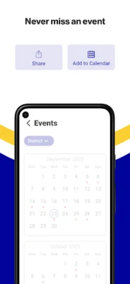NEVER MISS AN EVENT The event section shows a list of events throughout the district. Users can add an event to your calendar to share the event with friends and family with one tap. Â