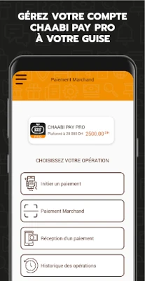 Avec Chaabi Pay Pro, encaissez instantanément votre argent, suivez vos opérations de caisse et gérez les paiements de vos clients en toute simplicité et quelle que soit leur montant grâce à une application mobile pratique et sécurisée offrant de nombreuses fonctionnalités :
