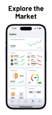 🧭 EXPLORE THE MARKET Always be informed which coins are trending right now, how high the Bitcoin dominance is and where the Fear & Greed Index stands.