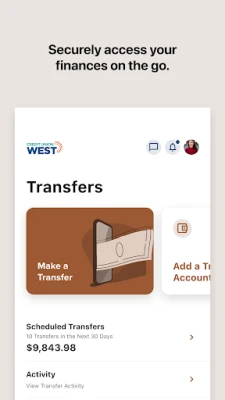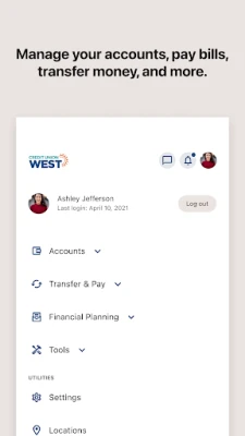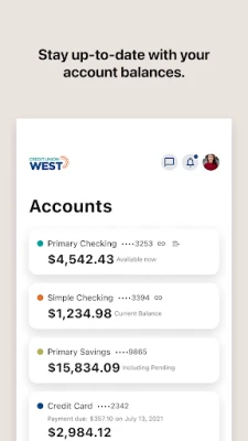 Credit Union West's mobile app provides quick, secure access to your CU West accounts. Easily check balances, view transactions, make transfers, deposit checks, pay your bills, or find nearby branch locations or ATMs.