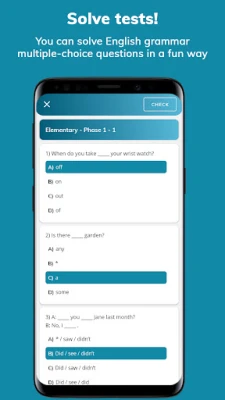 “English Grammar Tests” is the best application to learn English grammar. More than 10 000 premium quality English grammar multiple-choice questions are ready for you to solve in a fun way. The questions are properly sorted by their level so that you can solve questions according to your level. For best use of the app, it is recommended to begin with questions at an elementary level and gradually move up. You can achieve improvement in your English skills intensely using the “English Grammar Tests” application.