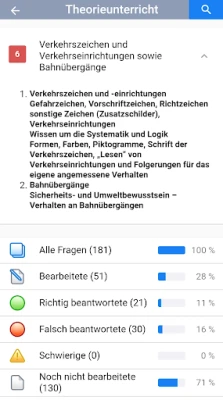 - Der Lernfortschritt kann mit dem Online-Lernsystems von Fahrschule.de (https://www.fuehrerschein-lernsystem.de) synchronisiert werden. Die Lizenz für die Vollversion des Online-Lernsystems kann separat erworben werden.
