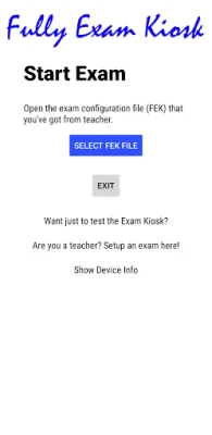 Students have to get an FEK exam file or link from the teacher. You can easily open the FEK file/link in the Fully Exam Kiosk and start the exam in the safe kiosk mode. When asked please grant the show on top and usage data access permissions needed for the safe kiosk mode.