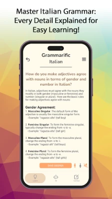 - Dive Deeper Functionality: Embark on a deeper investigation of intricate grammatical elements with the 'Dive Deeper' feature, stimulating further inquiry and mastery of the Italian language.