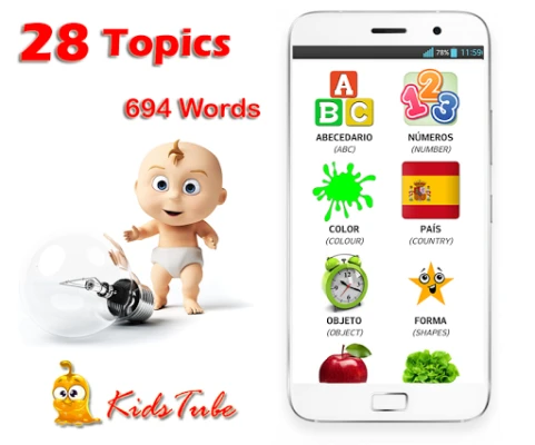 Learn Spanish for Kids has 24 topics which are around kids real life, 694 words vocabulary with sound and images of them . You can use all of them without network, it’s free.