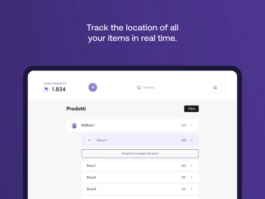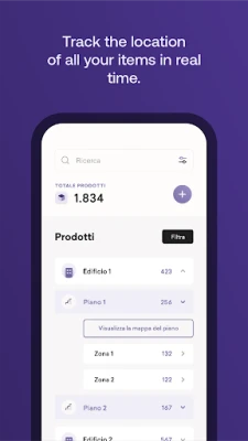 Through the App, you can keep under control the correct functioning of both the devices and the platform itself and receive diagnostic notifications; access data and consult the history and position of every single object traced; manage buildings, products, users, and much more.