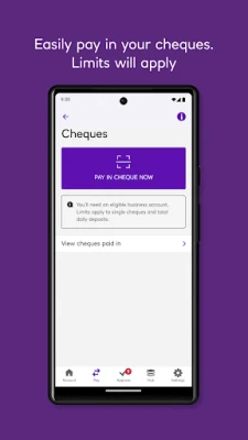 Cheque deposits: Pay in cheques directly through the app up to the value of £10k with a daily deposit limit of £30k per Bankline profile.