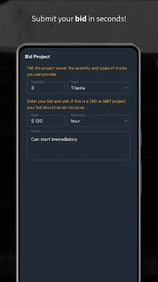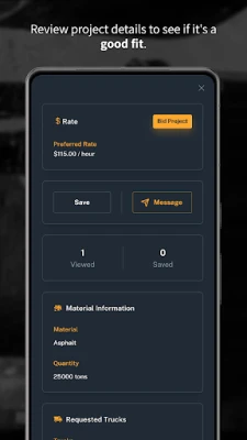 -Post projects quickly and easily, specifying the material, location, dates, rate, requirements, and other project details. Receive competitive bids from truck owners and brokers.