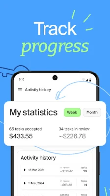 Track progress Monitor your task stats effortlessly. See which tasks are completed, under review, and track pending payments.