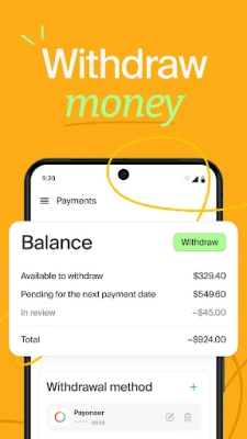 Withdraw money Easily check your available balance and withdraw money as needed. Keep track of payments for tasks that are still under review.