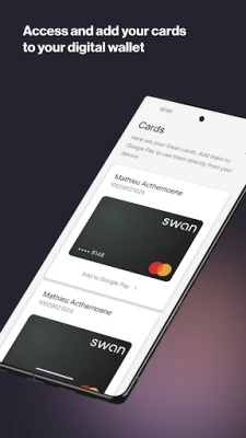 EASY CARD MANAGEMENT You can access all of your cards that were issued by Swan. Thanks to our easy consent system, add cards to Apple Pay or Google Wallet.